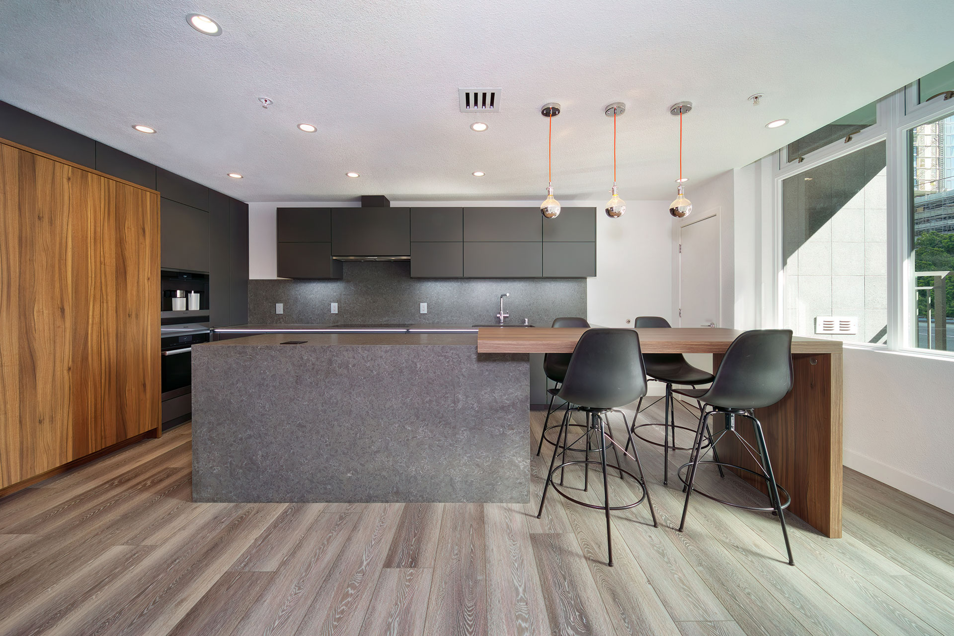 After flooding in their condo, our clients decided it was time to remodel. They wanted a European feel for their kitchen and entertainment wall units and approached us with competitive pricing. To achieve the desired look, we wrapped the backsplash in beautiful quartzite, opting not to install upper cabinets. We balanced the wood texture with carbon grey for a […]