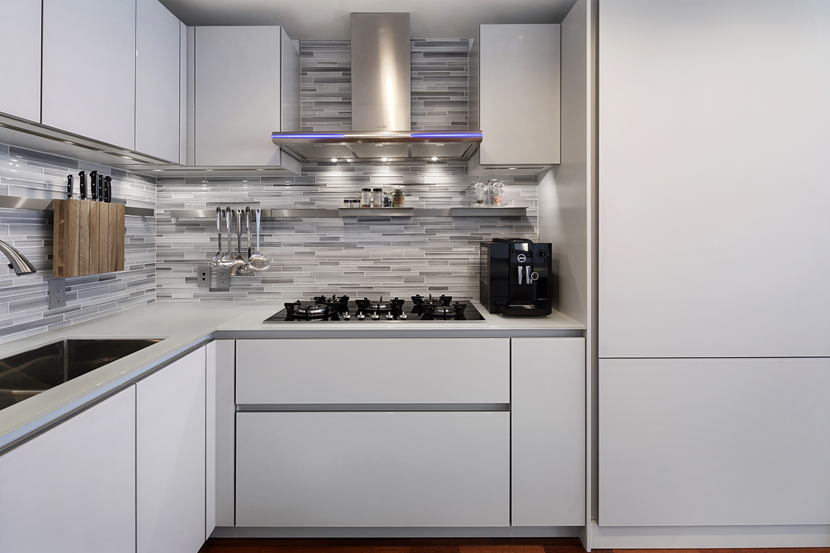 Our client, a medical professional, wanted a homey yet minimalist space to suit her busy lifestyle. We designed an elegant, clutter-free environment that supports work-life balance. By removing the old pantry, we created ample storage and space for full-size Miele appliances. Glossy white finishes add to the kitchen’s openness and functionality.