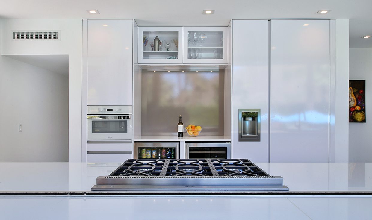 LEICHT’s signature high-gloss Sirius cabinetry anchors this modern kitchen, complemented by warm European wood laminate and clean white quartz countertops. The streamlined design maximizes both the stunning views and functional workspace with an integrated island and premium appliances.