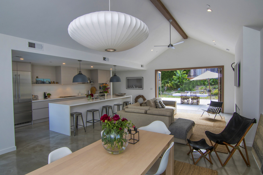 From floated shelves to a hidden pantry and flush-mount induction cook top, nearly every appliance has been hidden from view, giving this kitchen its unique design. By hiding functional elements, the room opens and flows into the rest of the living space, presenting a clean look and becoming part of the vernacular of the home.