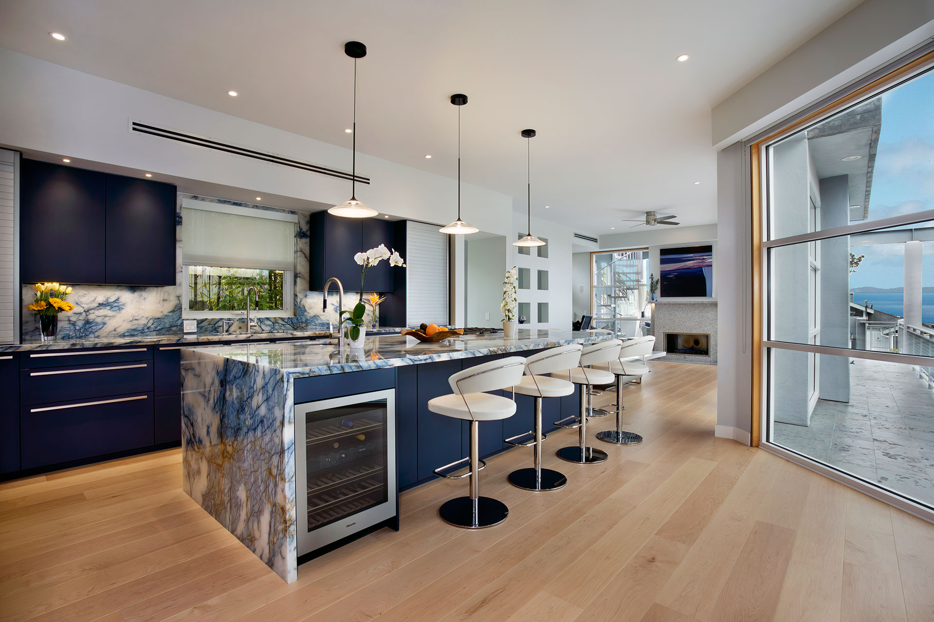 LEICHT’s signature high-gloss Sirius cabinetry anchors this modern kitchen, complemented by warm European wood laminate and clean white quartz countertops. The streamlined design maximizes both the stunning views and functional workspace with an integrated island and premium appliances.