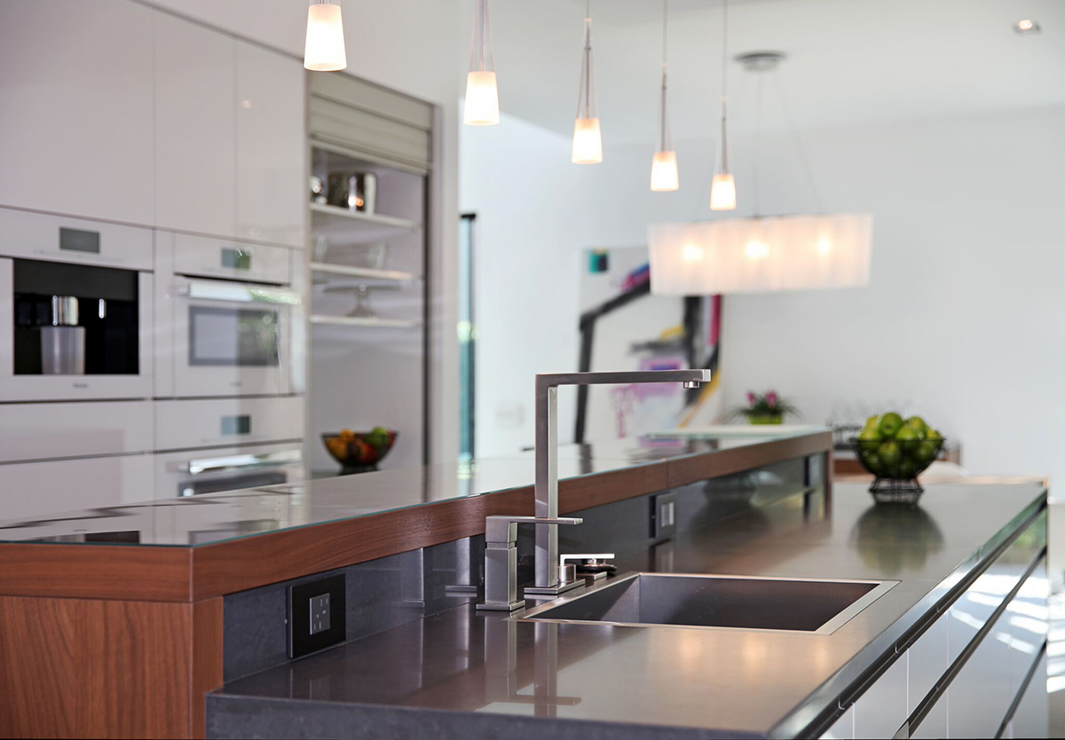 This La Jolla retreat kitchen combines LEICHT ORLANDO and Ceres cabinets with quartz countertops and a solid walnut bar for easy-maintenance luxury. The design was featured in LUXE magazine’s July 2017 issue for its seamless integration with the home’s clean architectural lines.