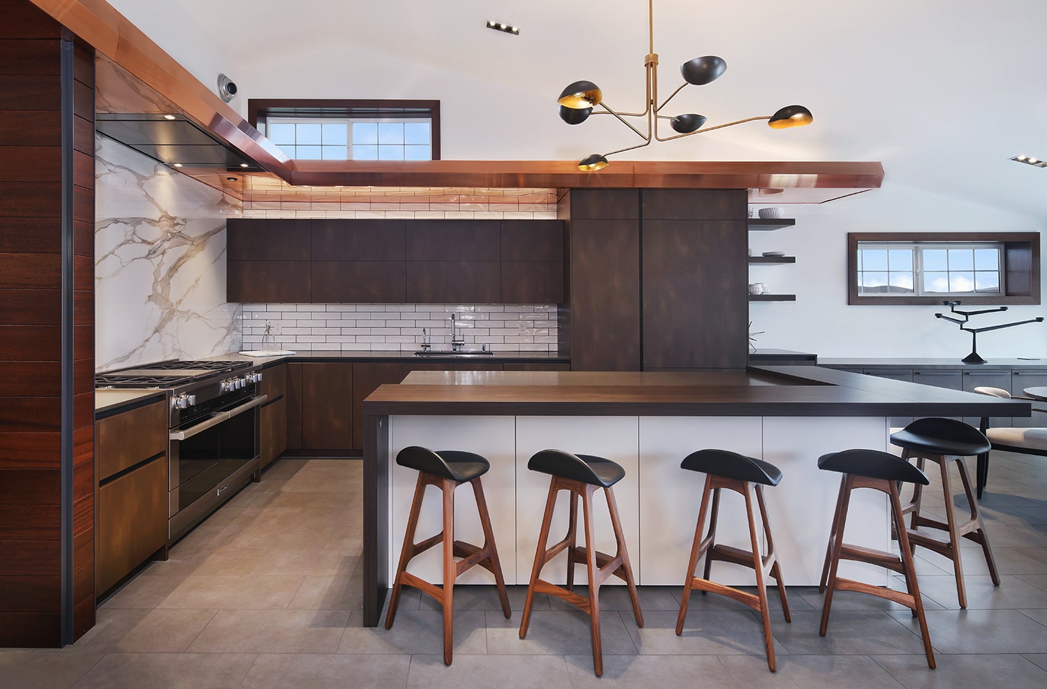 From floated shelves to a hidden pantry and flush-mount induction cook top, nearly every appliance has been hidden from view, giving this kitchen its unique design. By hiding functional elements, the room opens and flows into the rest of the living space, presenting a clean look and becoming part of the vernacular of the home.