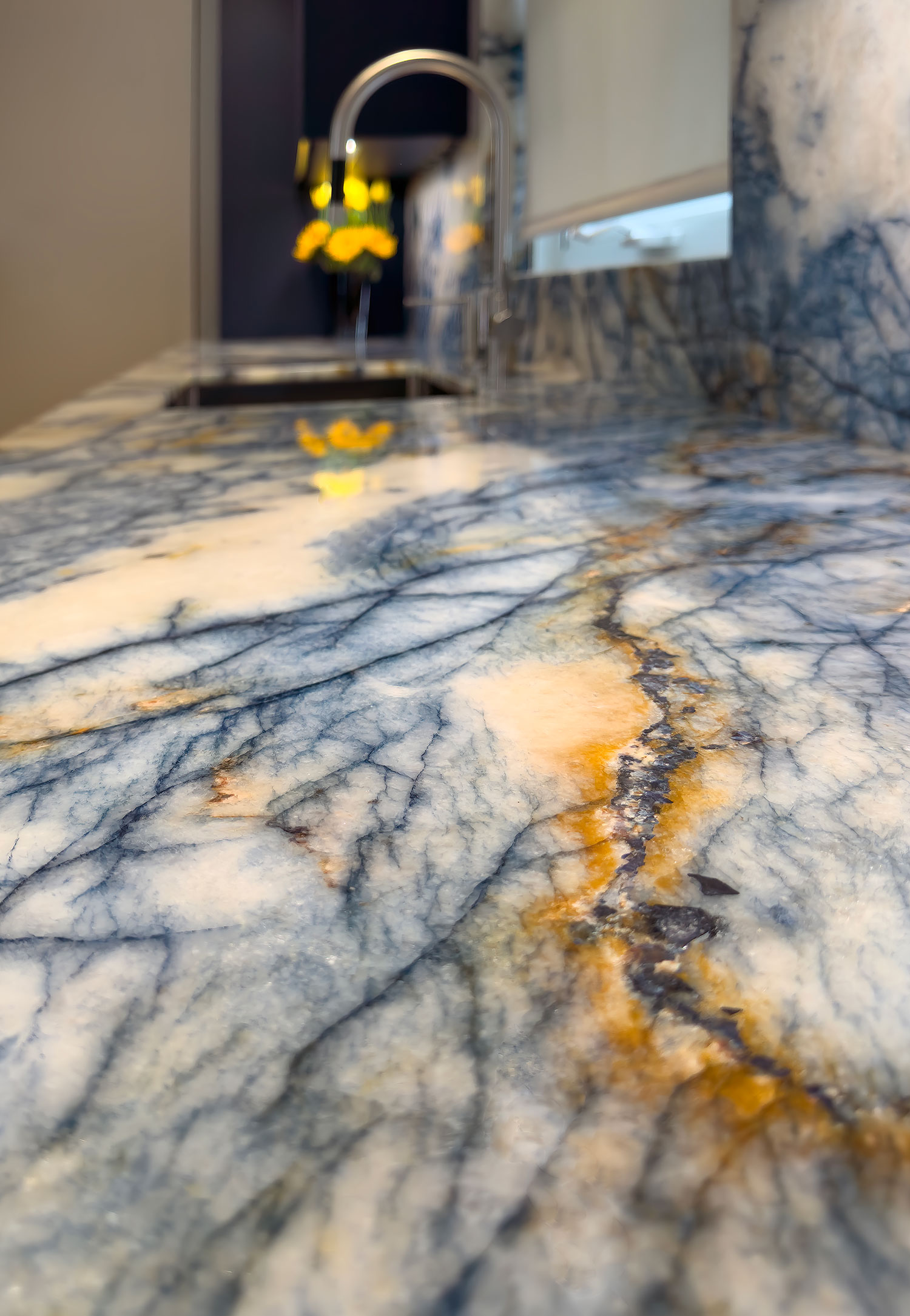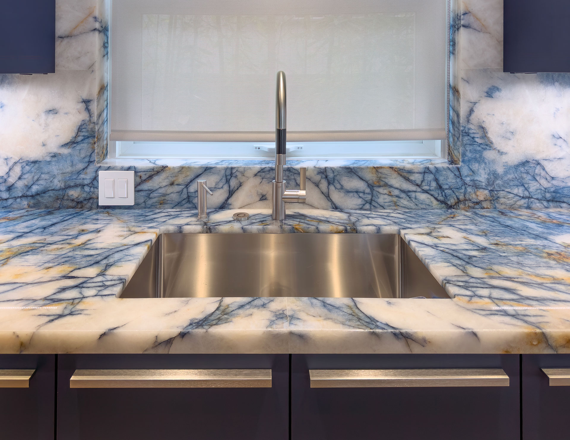 The elegant and durable surface quartzite countertop material gave this kitchen a perfect appearance and picked up the cabinet and floor colors in a pleasing and stylish manner for the family to enjoy a nice sunset evening.