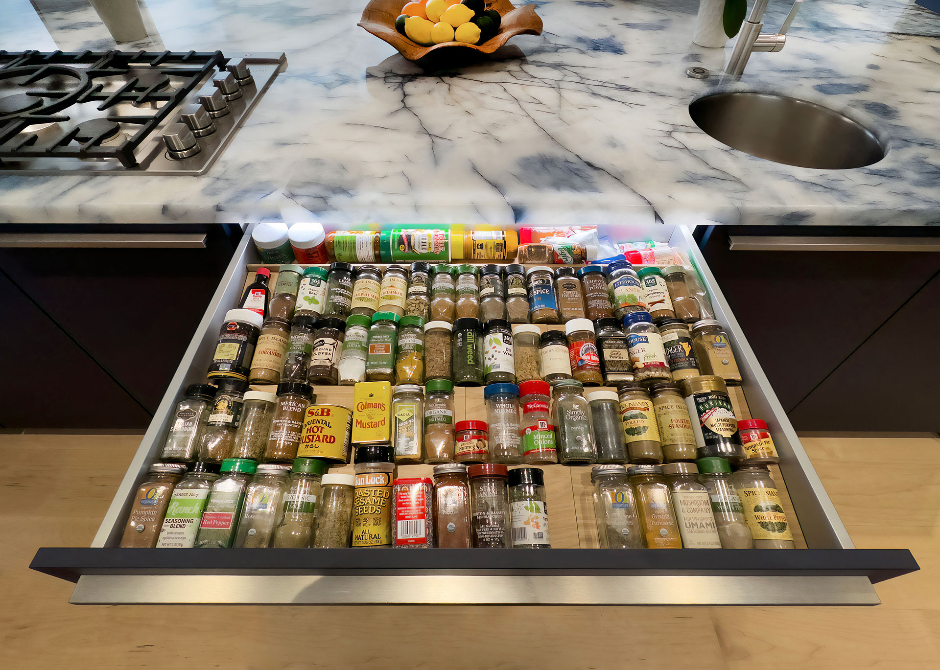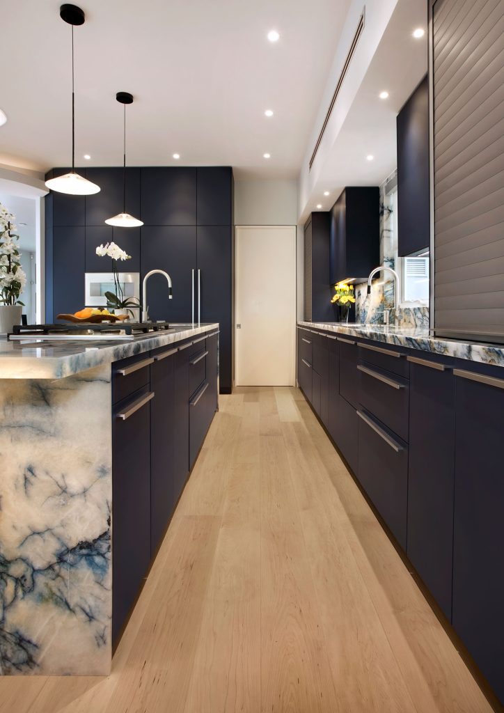 This client could not be separated from their old navy-blue Kitchen which extends the color of the ocean view into their lovely home along with the sandy beach color from their warm solid wood floors.