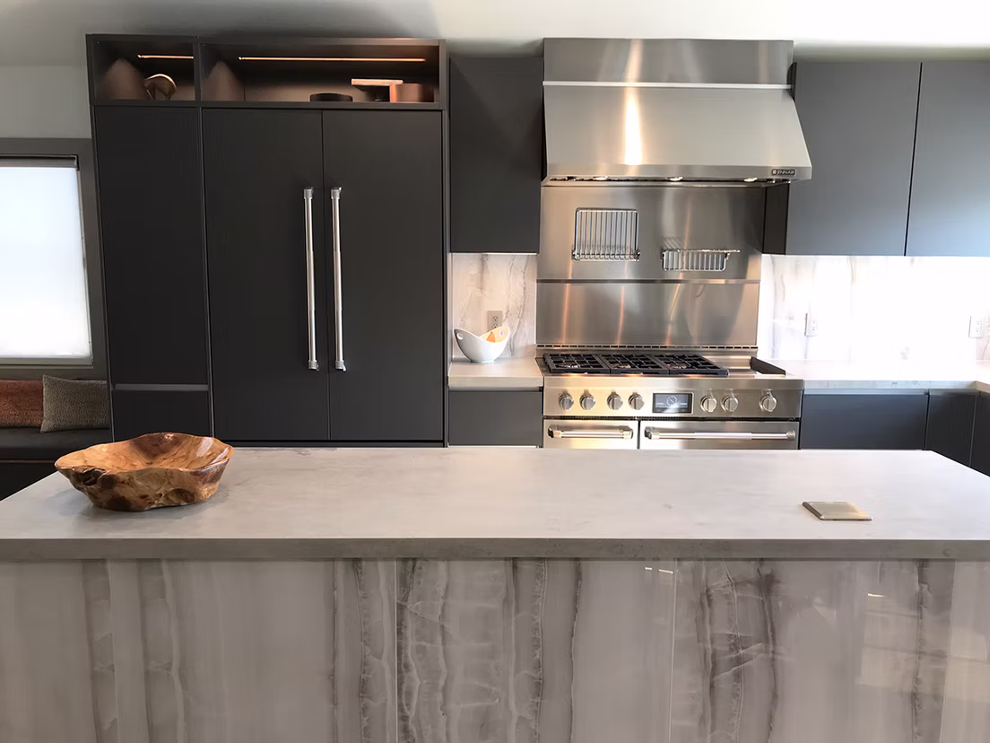 The foundation of their concept centered on LEICHT BONDI matte cabinetry, chosen for its sophisticated matte finish and clean lines. The clients contributed their own carefully selected stone, adding a personal touch that elevated the entire design. This collaborative approach, combining their industry knowledge with our installation expertise and their premium material selection, transformed a basic sketch into a stunning kitchen that perfectly complements its equally impressive surroundings.