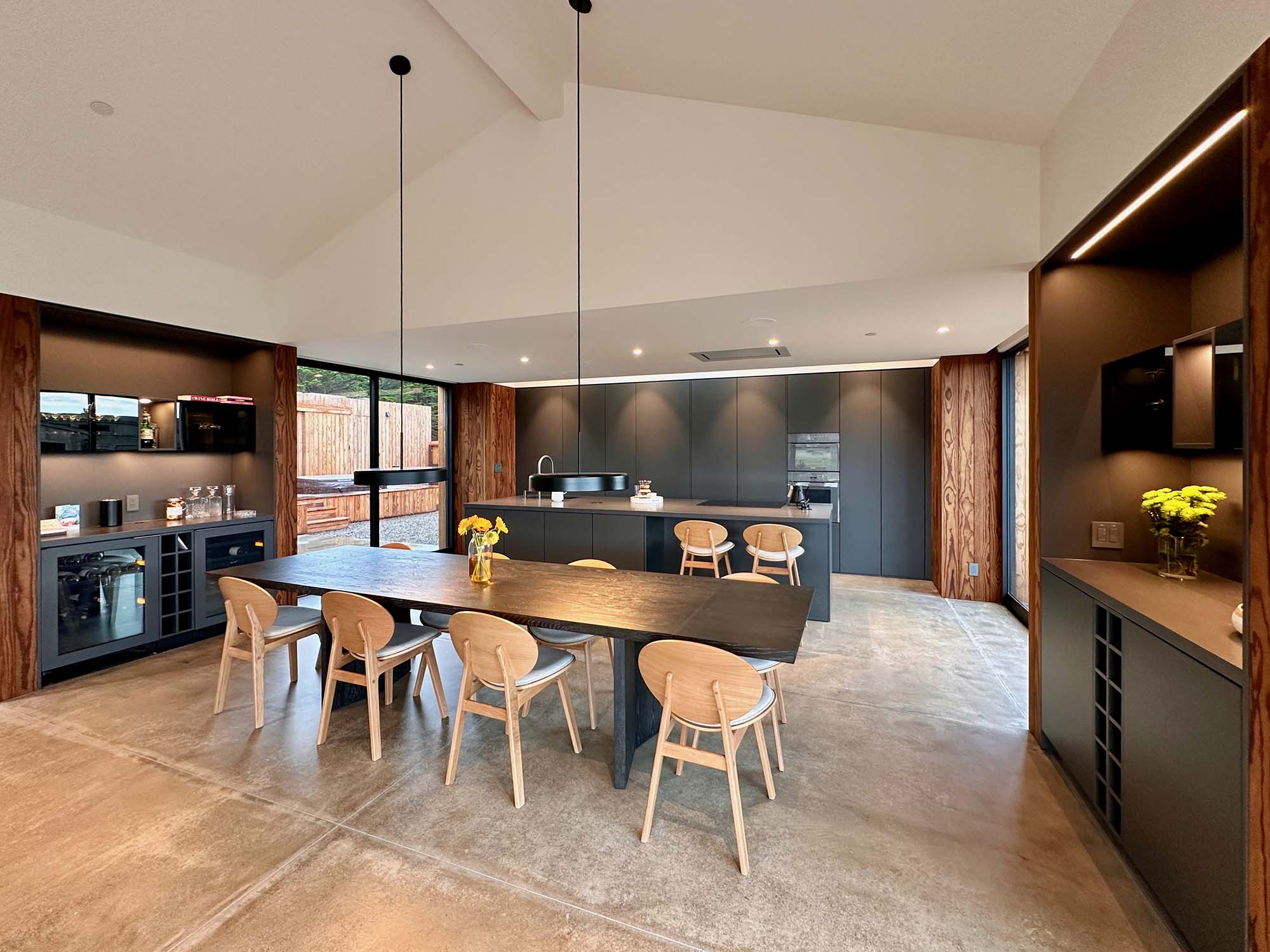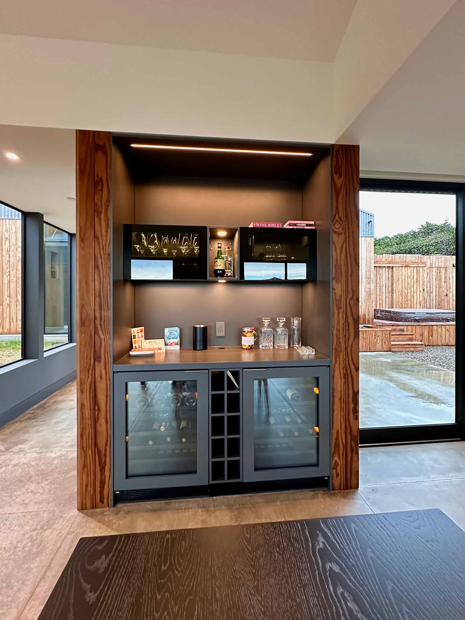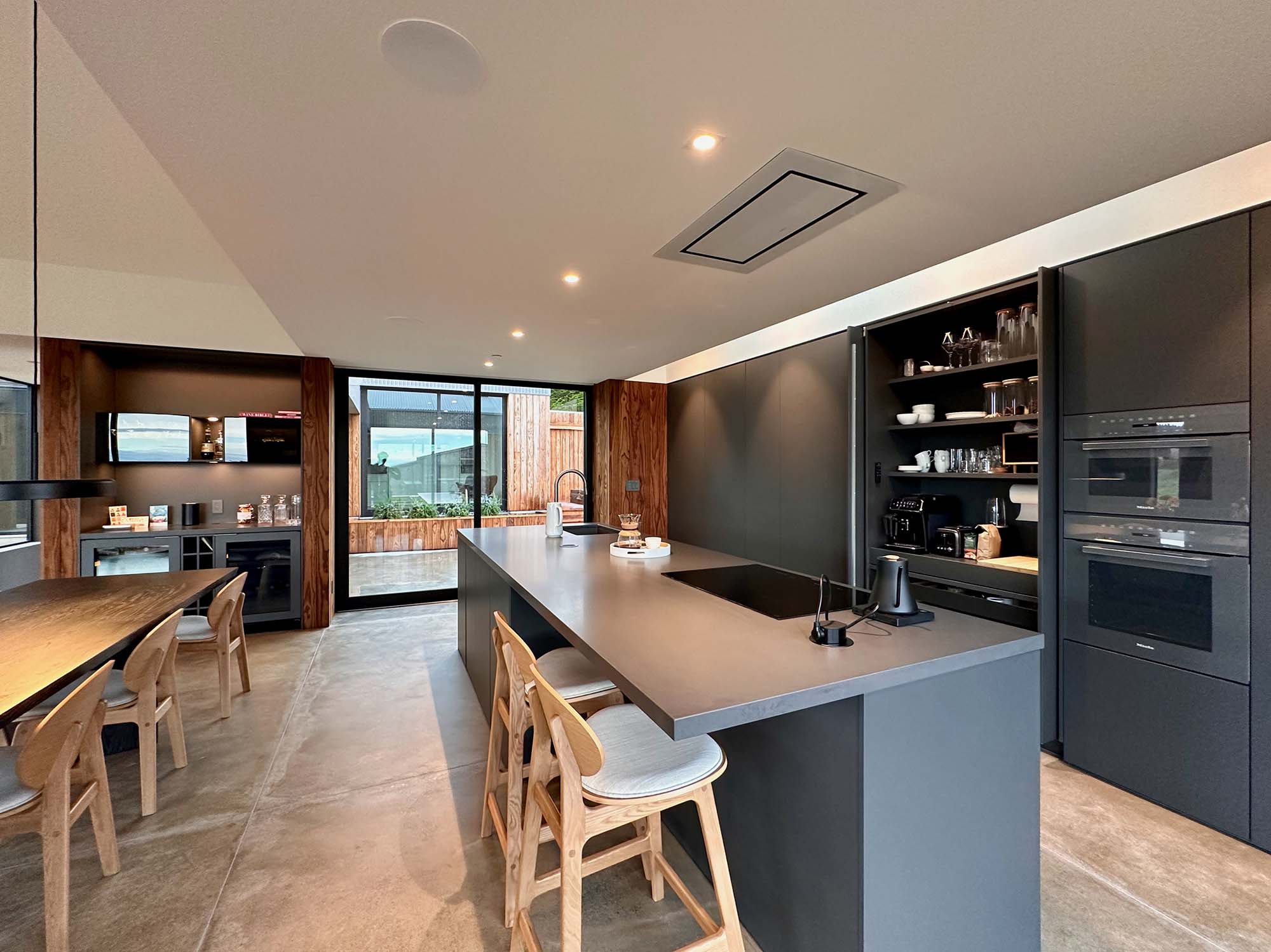 LEICHT was the ideal choice for this project, seamlessly meeting the client’s functional needs. Two standout features—both standard LEICHT options—enhanced the home’s clean aesthetic: a sleek pocket door coffee station that disappears when not in use, and a hidden garage entry that maintains the kitchen’s uninterrupted flow.