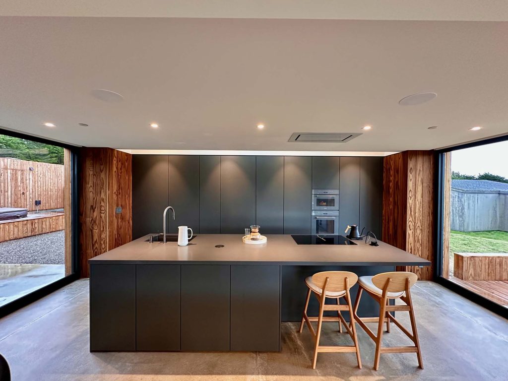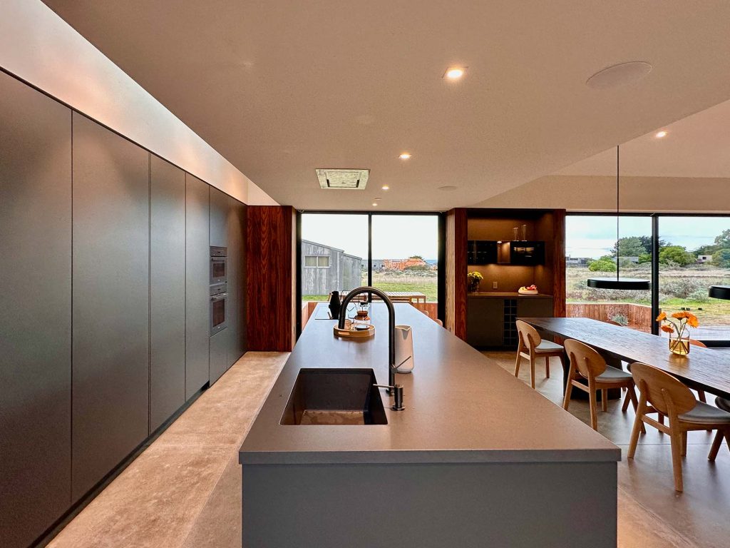 Custom wall paneling, chosen for its versatility indoors and out, became a defining element, reinforcing the home’s connection to its coastal environment.