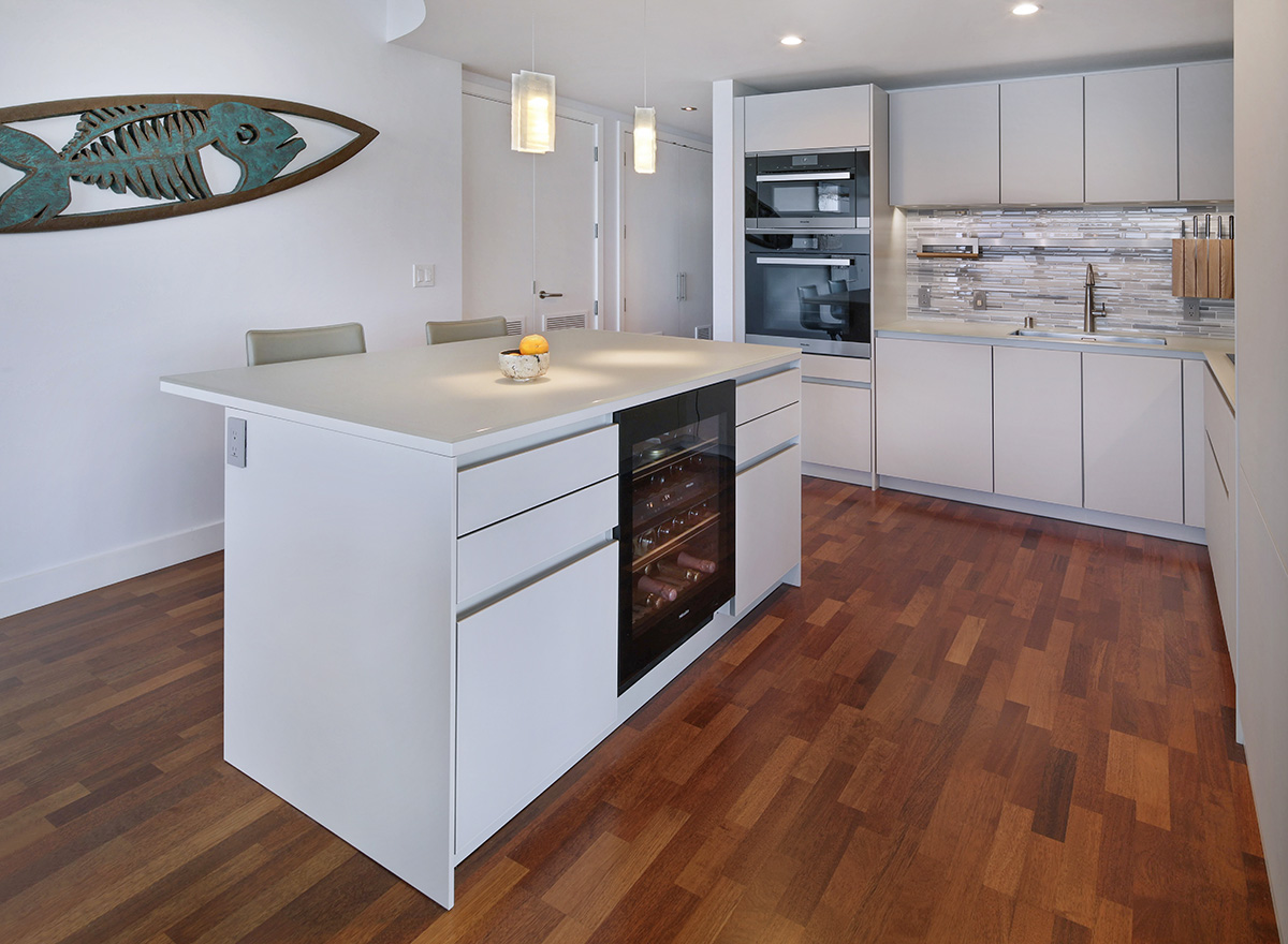 Hidden Miele appliances, cabinets, and countertops are matte glass. We chose the handle-free LEICHT CONTINO line, in all glass, neutral grey IOS-M, making a neutral backdrop for the client’s extensive art collection.