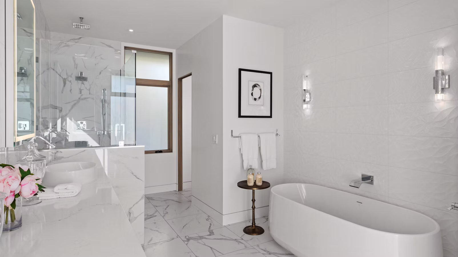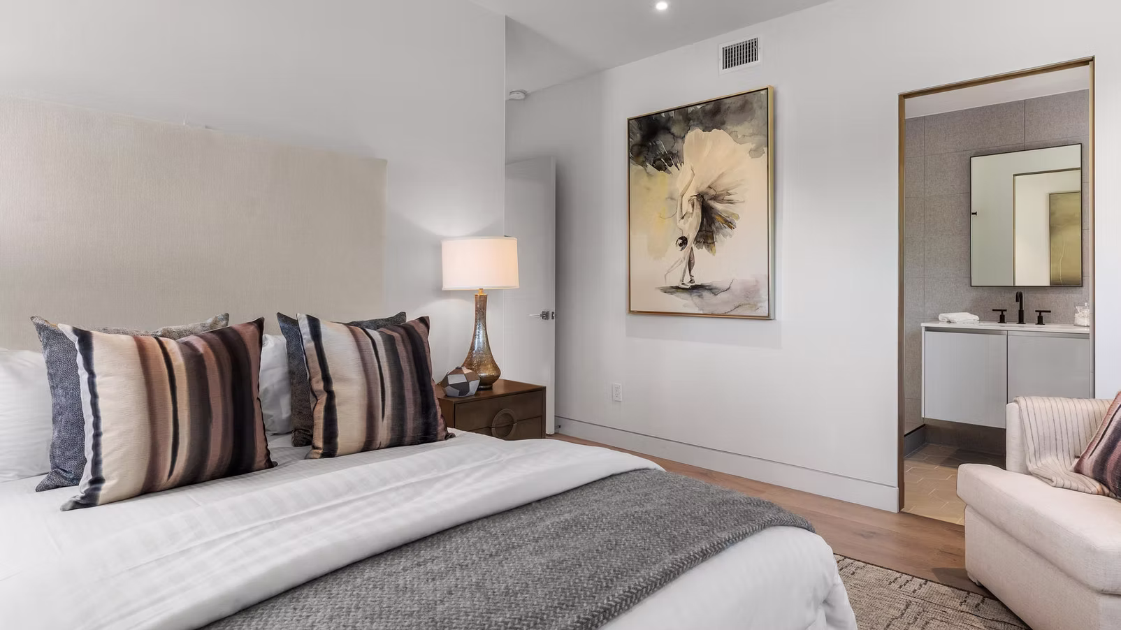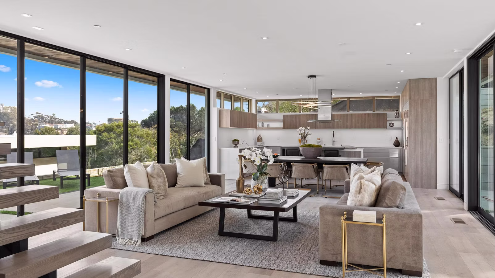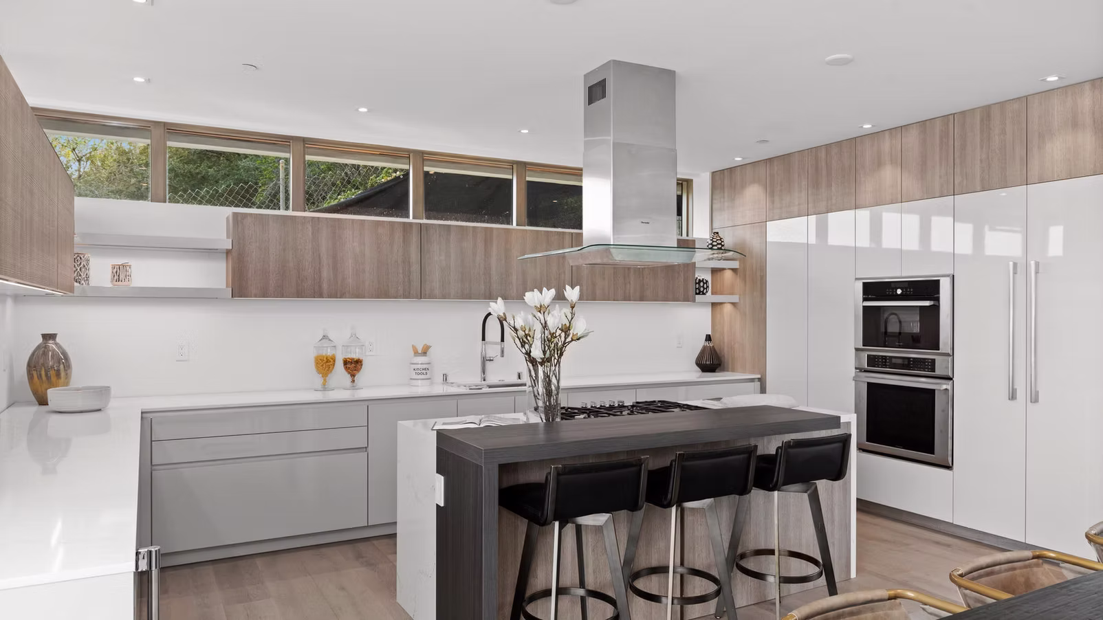 The design includes light wood flooring, flat-panel gray cabinetry, and white quartz countertops and backsplash. A large island provides both workspace and gathering space, while stainless steel appliances integrate cleanly into the cabinetry for a streamlined look.